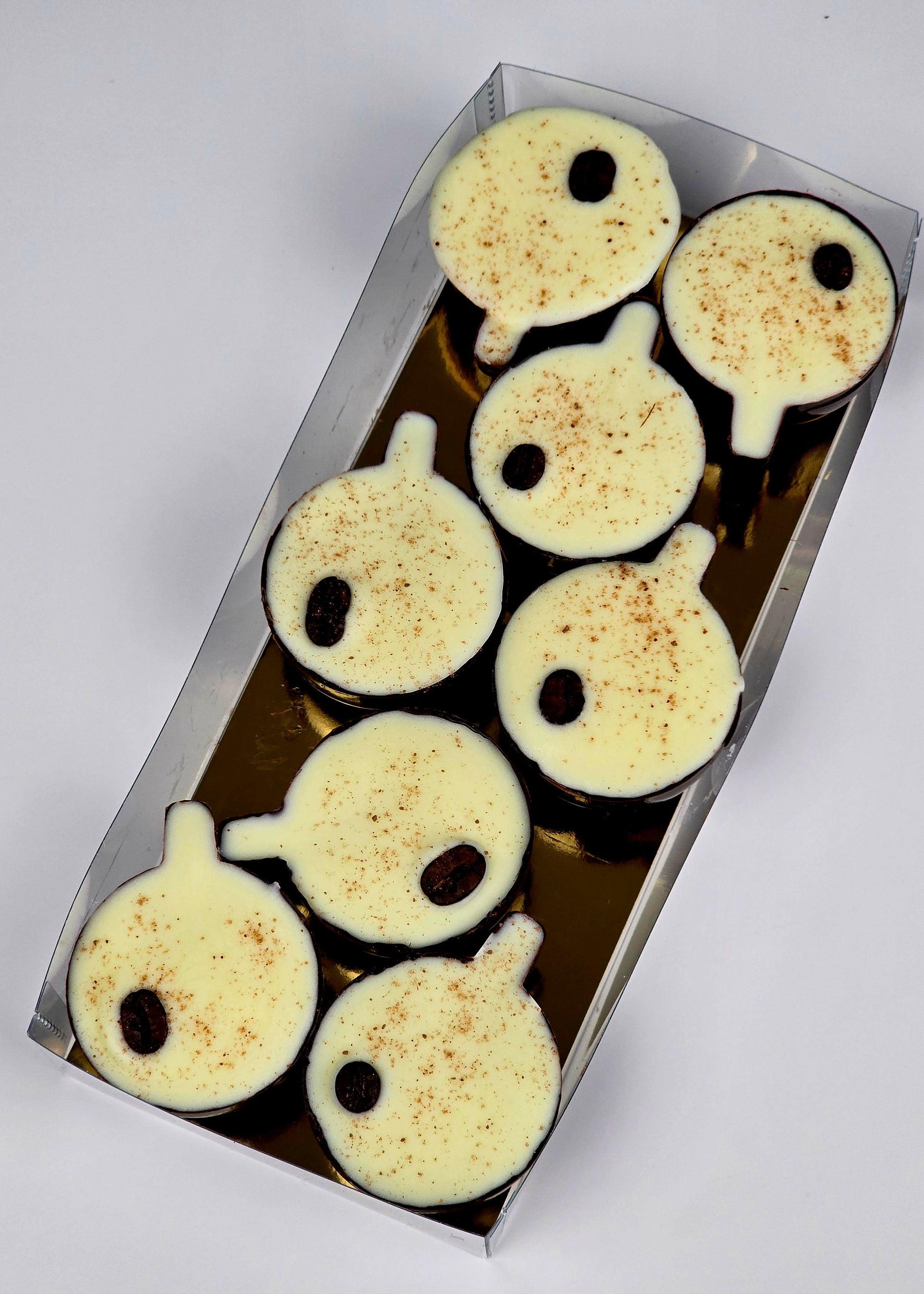 Meine handgefertigte Cappuccino-Praline vereint feinste Schokolade mit einer cremigen Kaffee-Füllung - ein kleines Meisterwerk für alle, die Kaffee und Schokolade lieben.